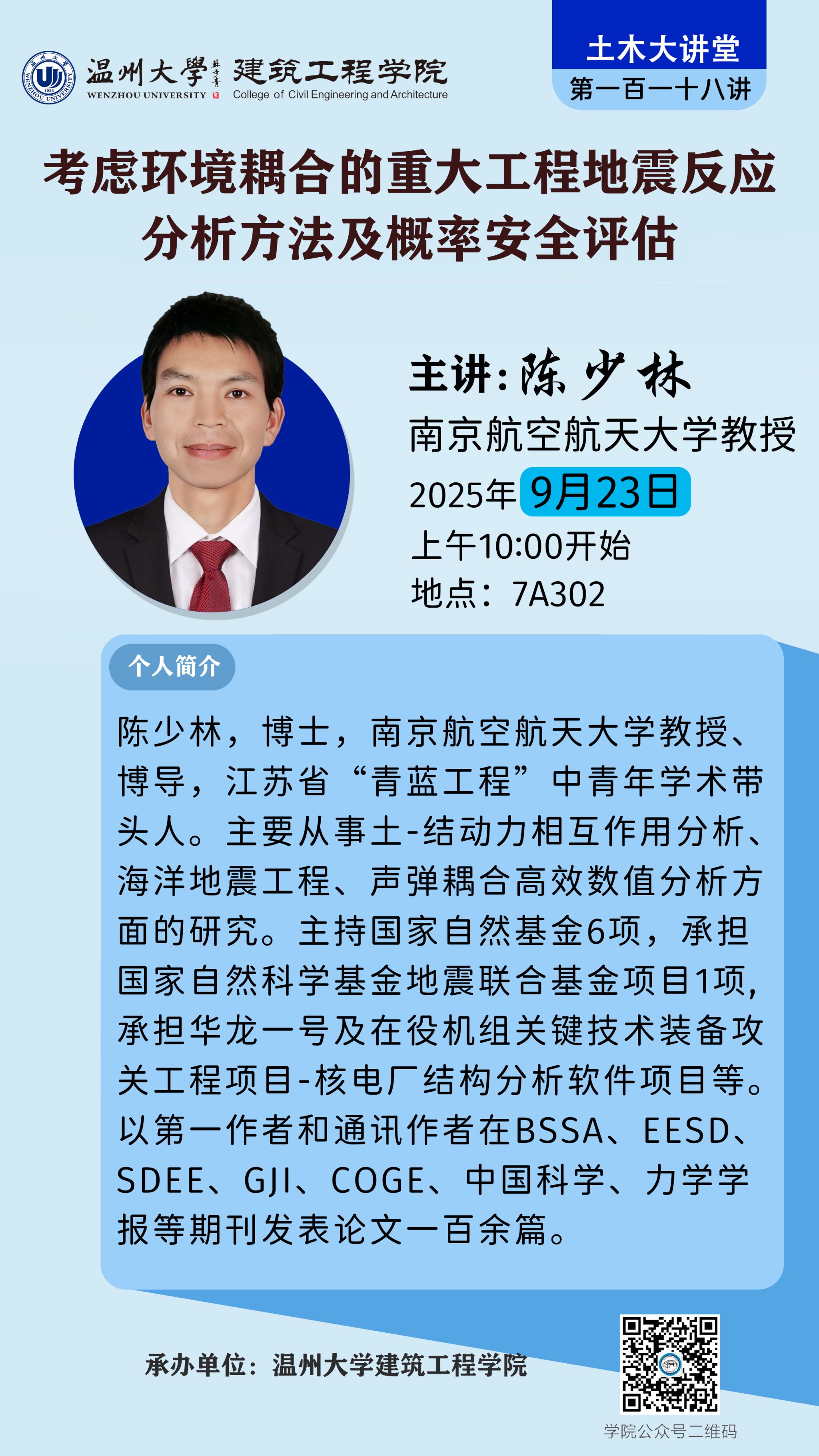 学术讲座预告:考虑环境耦合的重大工程地震反应分析方法及概率安全评估