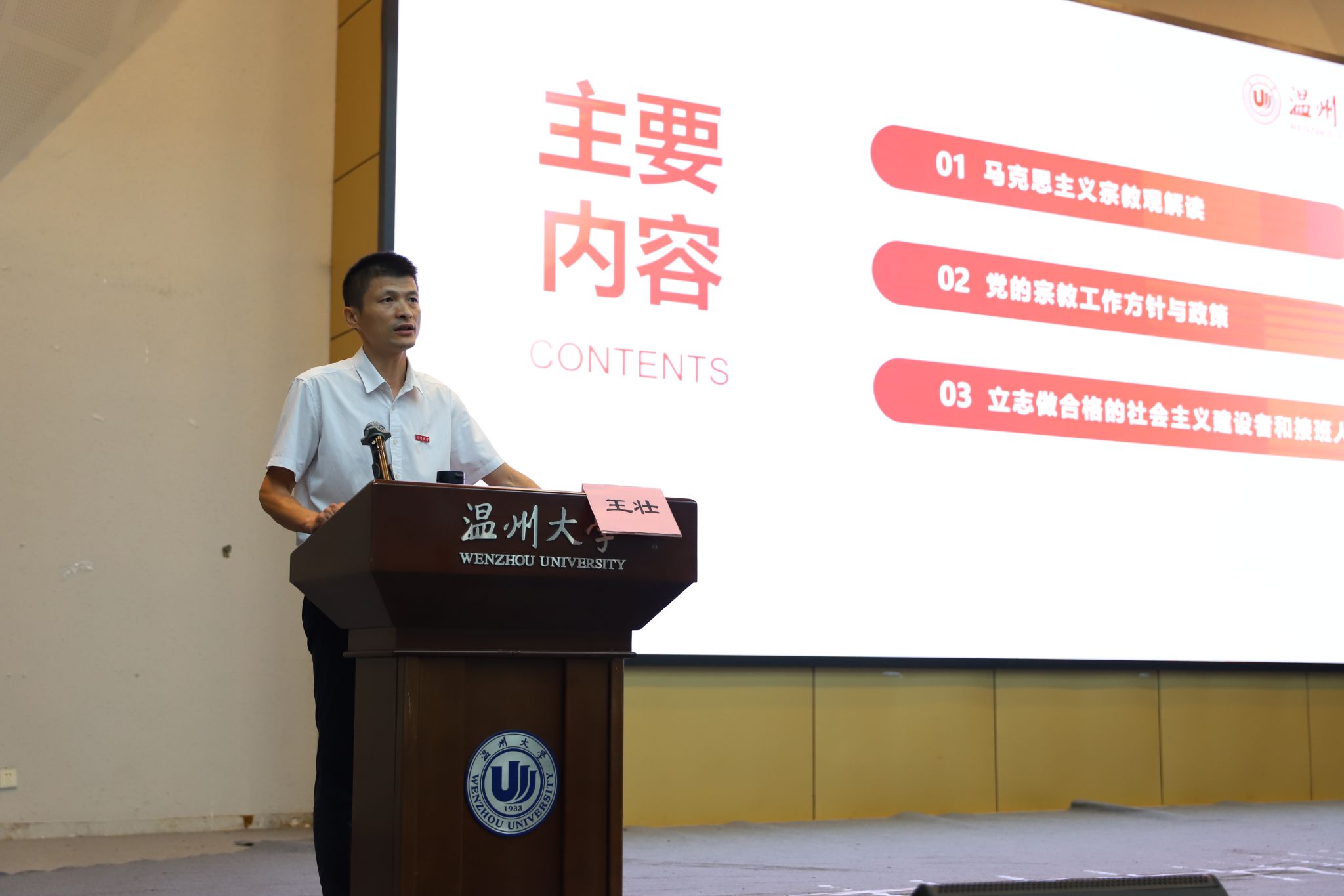 王壮书记对马克思主义宗教观与党的宗教政策进行解读,他结合典型案例,指出宗教极端思想的传播特点与潜在危害,着重强调教育领域涉宗教“十不得”规定的重要性,明确禁止任何组织和个人在校园内开展宗教活动、传播宗教思想,要求同学们自觉抵制宗教渗透,维护校园意识形态安全。