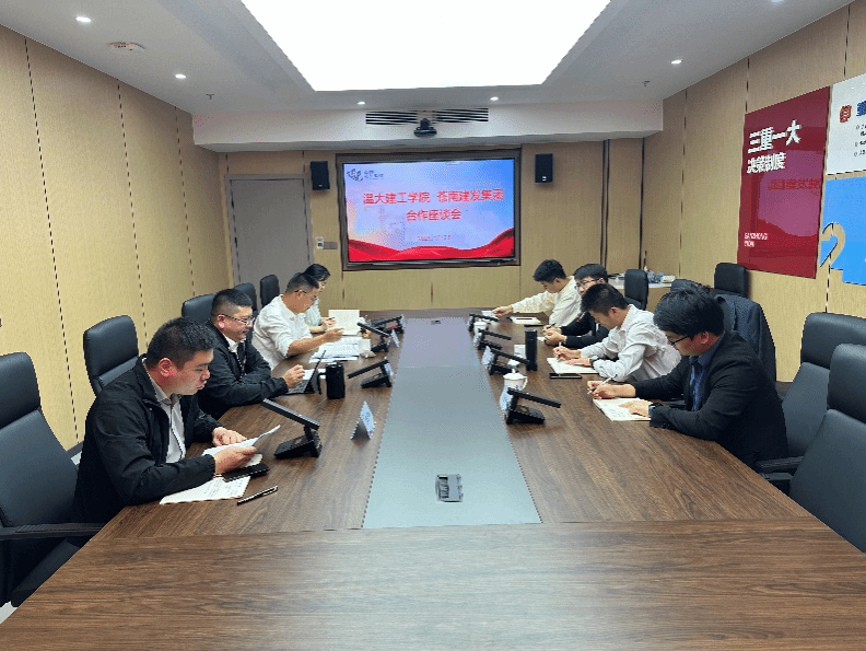 党委书记王壮、副院长符洪涛、学术副院长倪俊峰及高紫阳老师一行前往苍南县建设发展集团有限公司就“科技副总”合作开展交流。集团党委书记、董事长项延良,集团党委副书记、纪委书记张文校,工程技术部部长林初虎、人力资源部部长叶塞及相关人员出席了座谈会。
