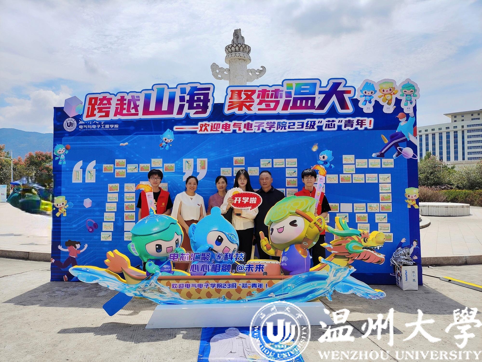 电气与电子工程学院采用“以‘芯’迎新,薪火相传”的理念,融合学院专业特色和第19届杭州亚运会主题,将科技风和运动风相结合,迎接305名本科生、79名研究生的到来,寓意着“点亮科技,爱达未来”。