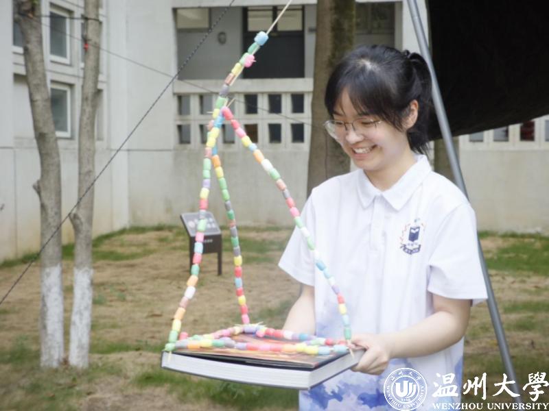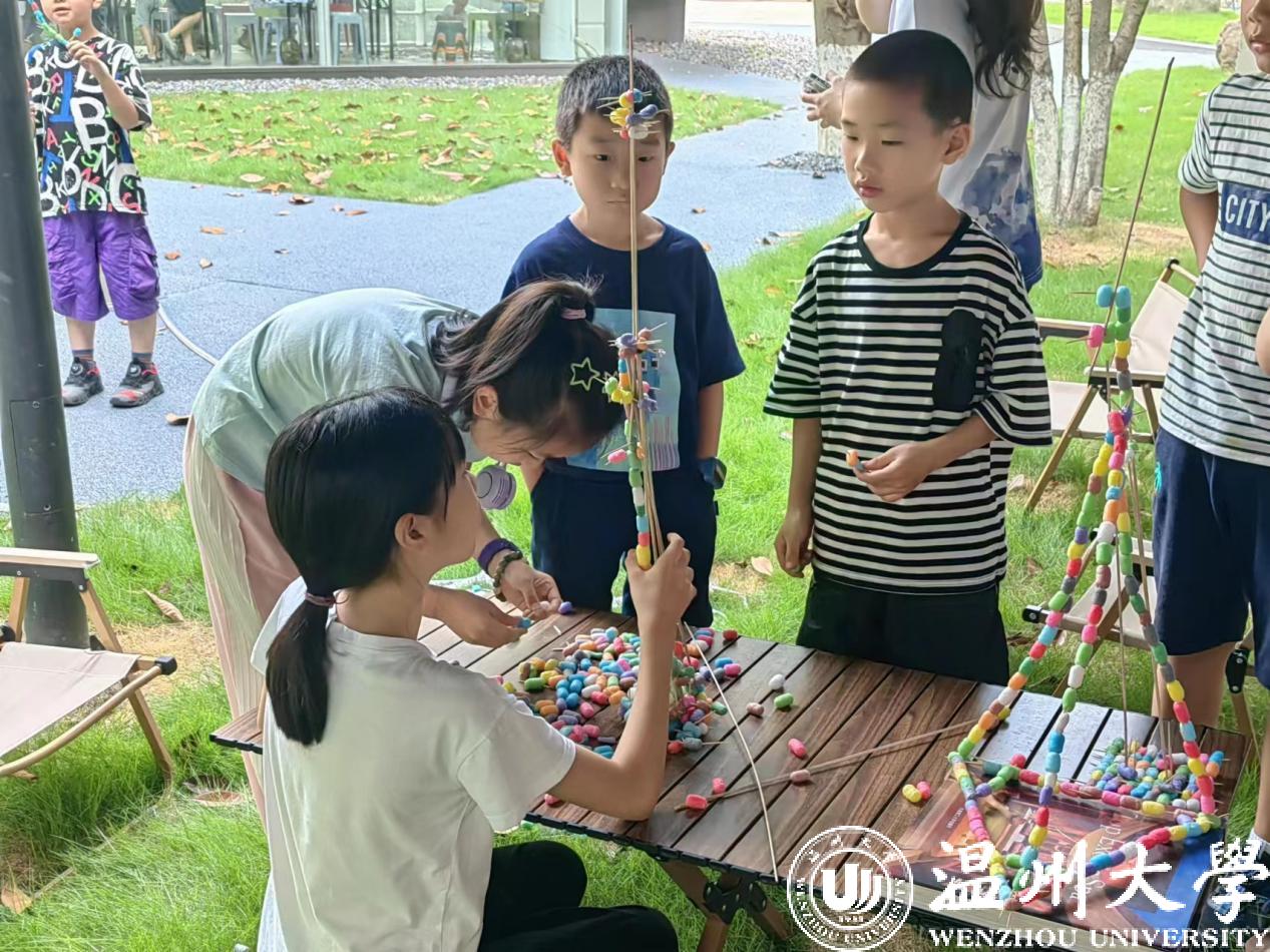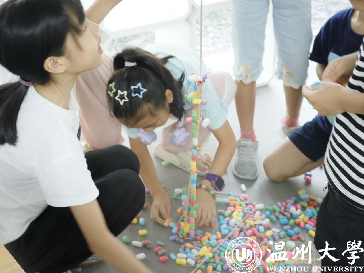 暑期实践队和小朋友们一起开展了一堂“温大第一高楼”建设大比拼。活动利用牙签、木棍与彩色泡沫球搭接,进行“建设大比拼”,对比各组的搭建高度。