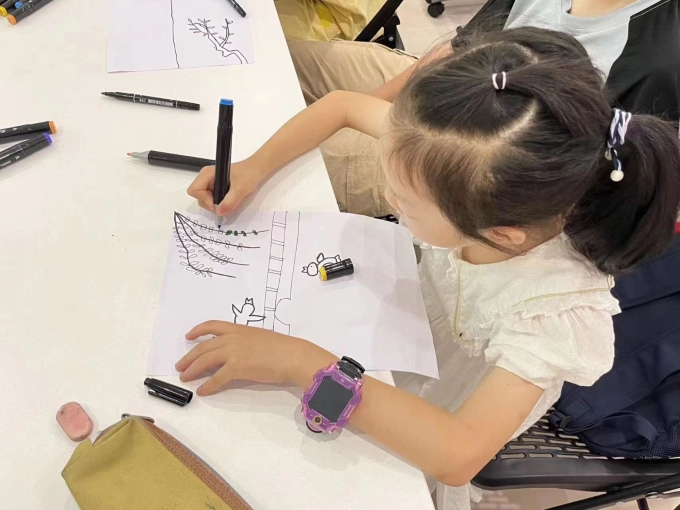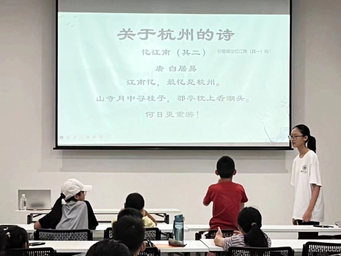 活动中,在预热环节,大家分享关于杭州的诗词,诗词的意象在大家徐缓的音波和工整的平仄格律中跳动;过渡环节,老师翻译《忆江南·其二》,指引孩子们用白话文构建诗中的意境。一首白居易《钱塘湖春行》,携大家由诗入画,先找出诗内的意象,再由此搭建起洋溢着盎然春意的湖畔美景,孩子们自行画出诗中呈现的景象,孩子们的构思可谓是天马行空、千姿百态,而其作画更是百花齐放,交相辉映。课上诗画相生,折射的是独具中国式浪漫的山水田园史诗,潜移默化中塑造了我们的民族审美,民族性格。