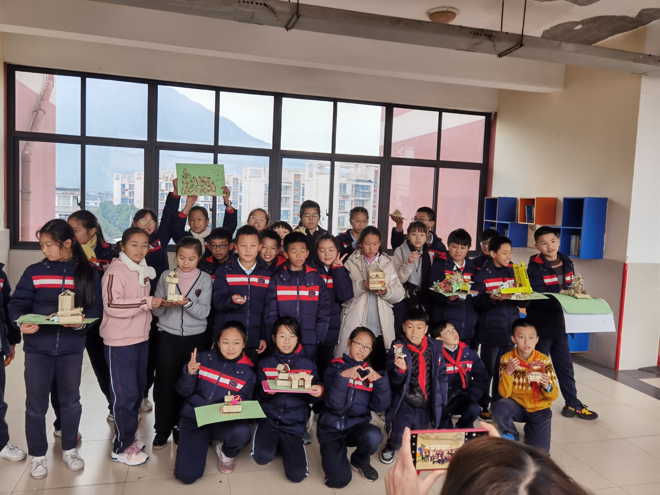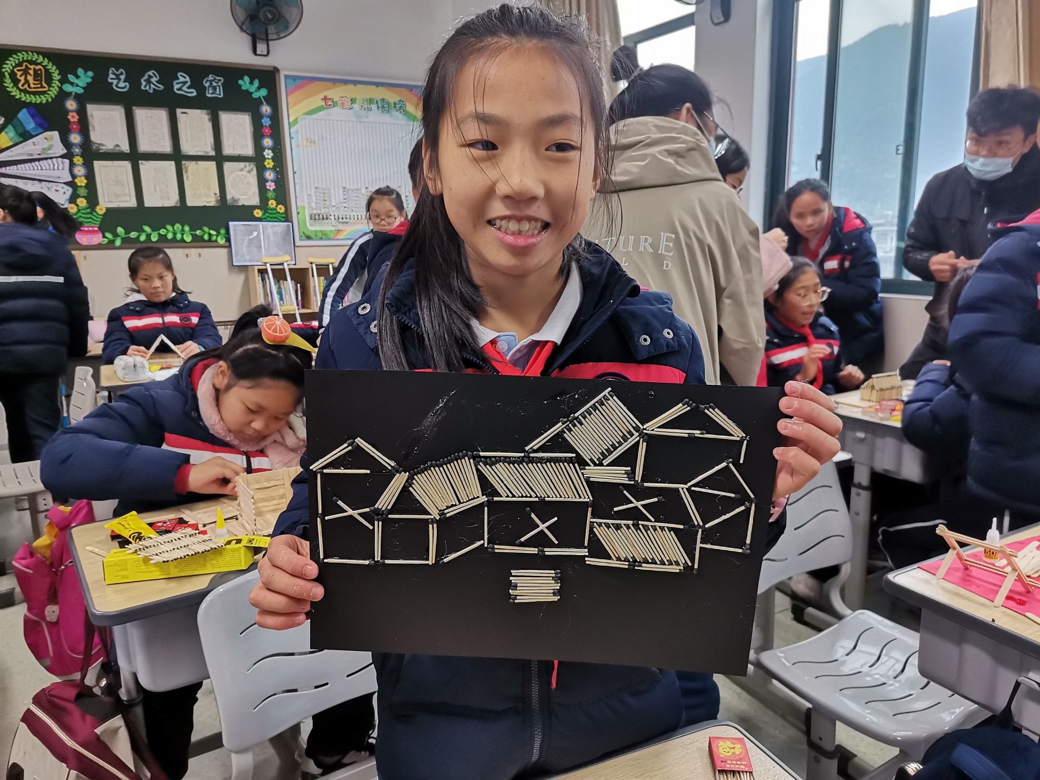 小学生火柴艺术作品合影。