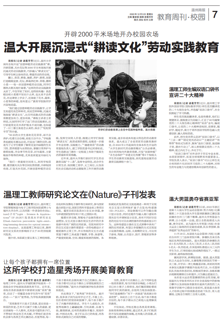 推行新时代学生劳动教育实践“十二条”,发挥专业特色,结合学生日常生活、校园勤工助学、义工岗位,以及依托社会实践活动和志愿服务工作开展劳动教育实践,逐步形成具有温大特色的劳动教育体系。温大成立了全省首家劳动教育教研室,自2022年2月起面向全体本科生开设的“大学生新时代劳动教育概论”公共必修课,充分利用校内外教育资源,开发“创意种植”“水生态保护”“非遗文化传播”等9个校级大学生劳动教育实践基地,依托基地设置劳动教育实践课程十余门。
