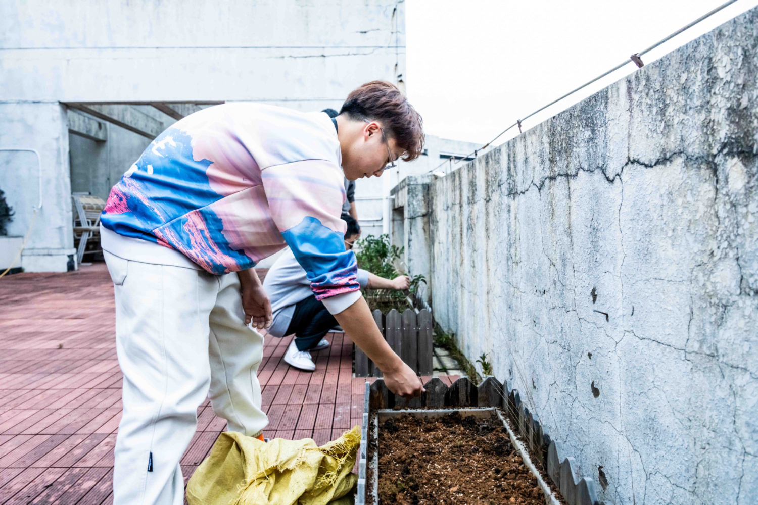 同学们在空中花园种植种苗。