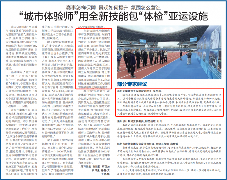 、温州理工学院、温州设计集团等高校、国企的专家组成的“城市体验师”团,先后造访亚运赛事场馆、训练场地、相关酒店及周边,详细查看赛事保障、景观提升、氛围营造等方面的工作情况,针对存在的问题提出建议。