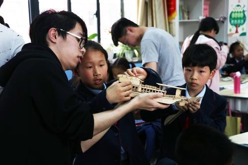 “大哥哥,这块零件要拼在哪里呀?”在三年四班的教室里,小朋友们拿着红船模型的小零件询问大学生哥哥。大学生们手把手教孩子们制作模型,并让孩子们发挥想象力给红船上色,一会儿,教室里就出现了一艘艘独具特色的红船,它们是红船精神的传承,更是对红船精神的创新。