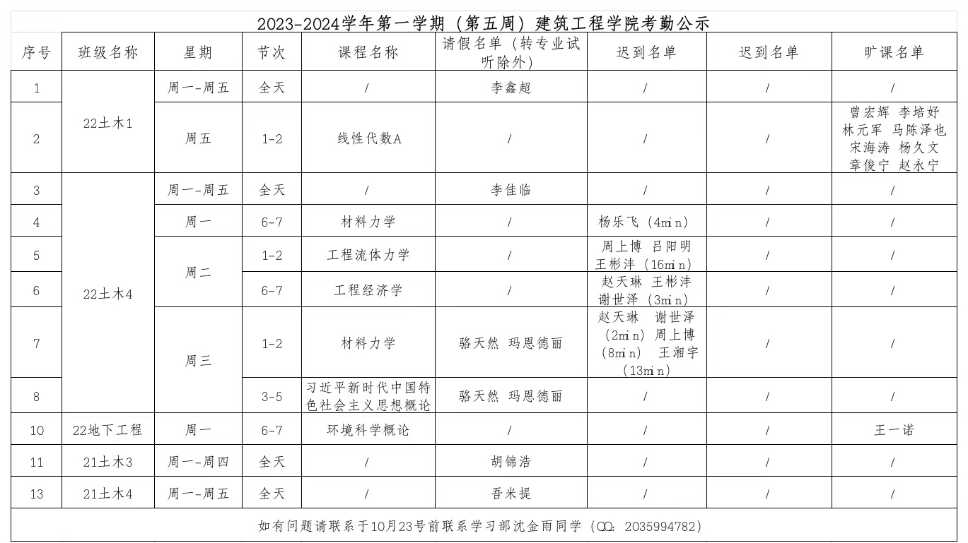 2023-2024学年第一学期(第五周)javhd 考勤公示