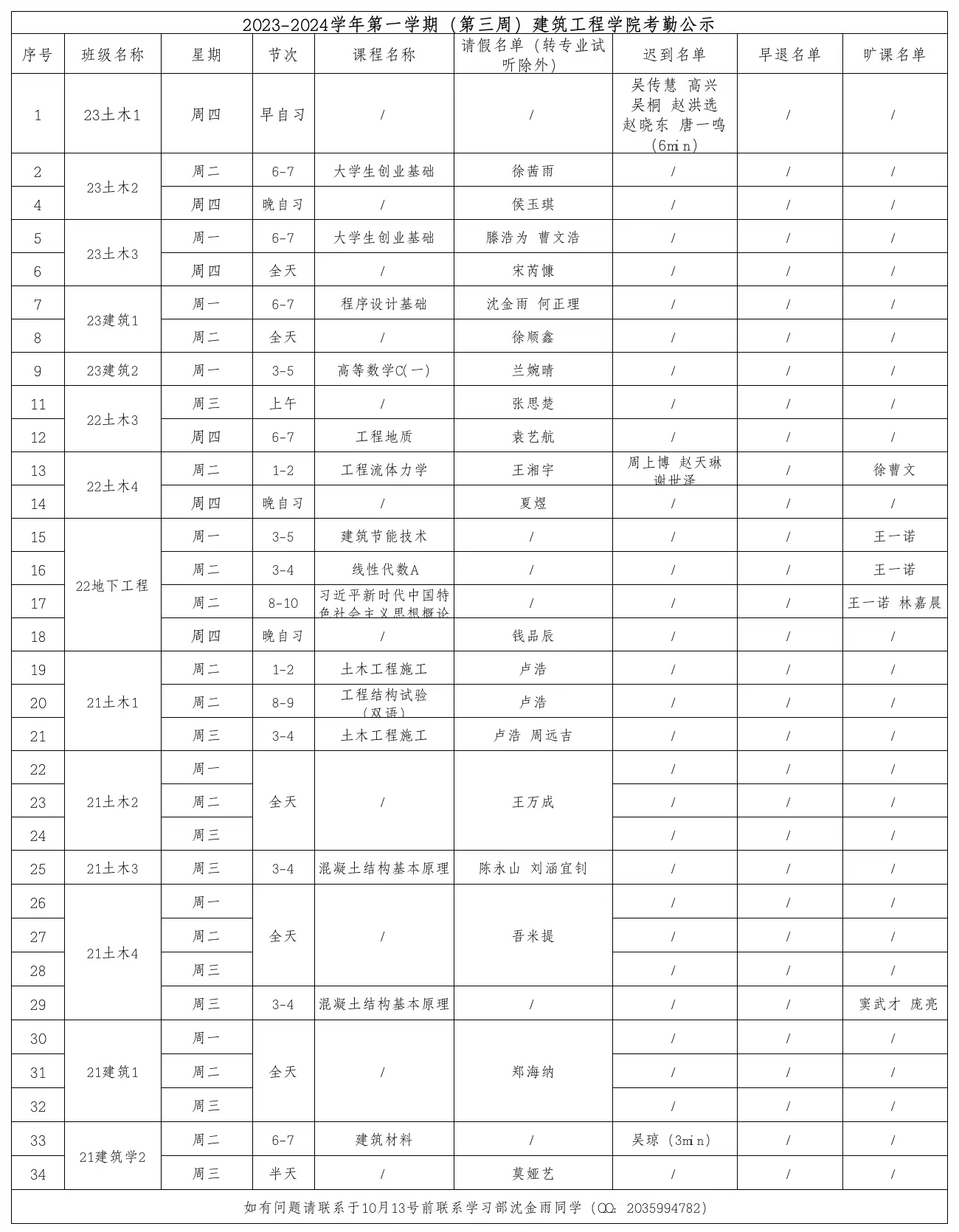 2023-2024学年第一学期(第三周)javhd 考勤公示