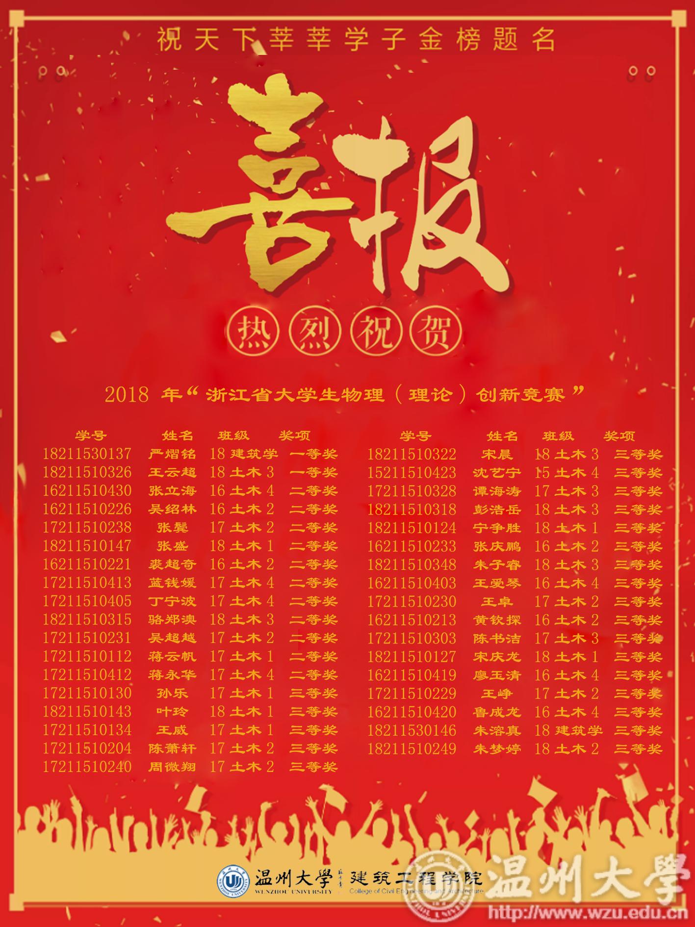 2018年浙江省大学生物理(理论)创新竞赛获奖喜报