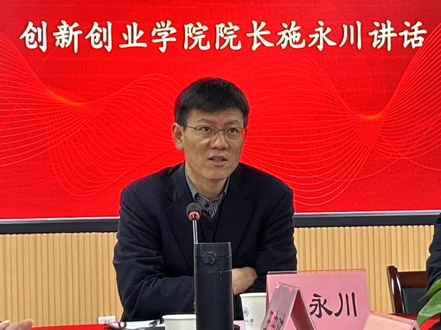 创新创业学院院长施永川讲话。他提出三点希望,一是要努力成为“复合型”人才;二是要脚踏实地,更要仰望星空;三是要注重自身能力培养。在实践中成长,不断充实自我、学有所得、学以致用。