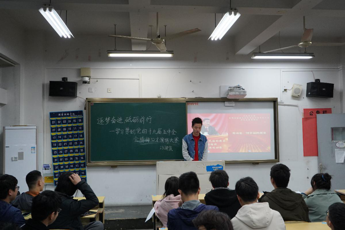 2019级各班学生在建工楼各教室举行“逐梦奋进,砥砺前行——学习贯彻党的十九届五中全会精神”主题口才演练大赛。学工办主任潘莉莉老师、辅导员杨程程、刘臣玉、黄骑骥、蔡菲菲、华昊南老师受邀担任评委,2018级15位学生组成观众评委团参与评比。本次大赛由各班素拓委员主持。