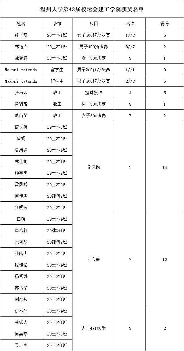 建工学子Makoni tatenda、程子珊分别在男子200米、男子400米、女子400米比赛中取得第一、第三的好成绩,学院集体项目旋风跑获得了冠军。
