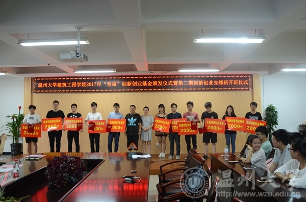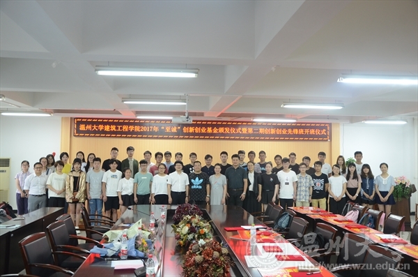隆重举行。浙江至诚建设有限公司董事长陈建德、总经理董春华女士、学生处处长张敏、校友办主任杜友坚、教务处副处长赵燕、学院院长孙林柱以及全体获得基金学生代表和学院第二期创新创业先锋班全体学员参加仪式,仪式由学院党总支书记刘青松主持。